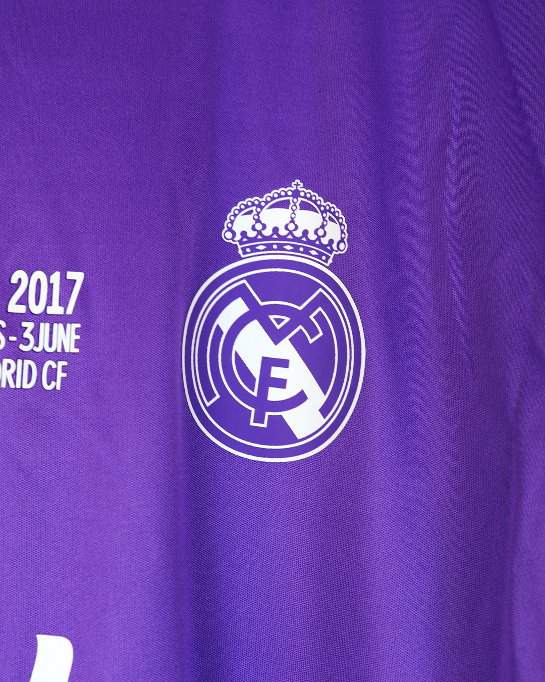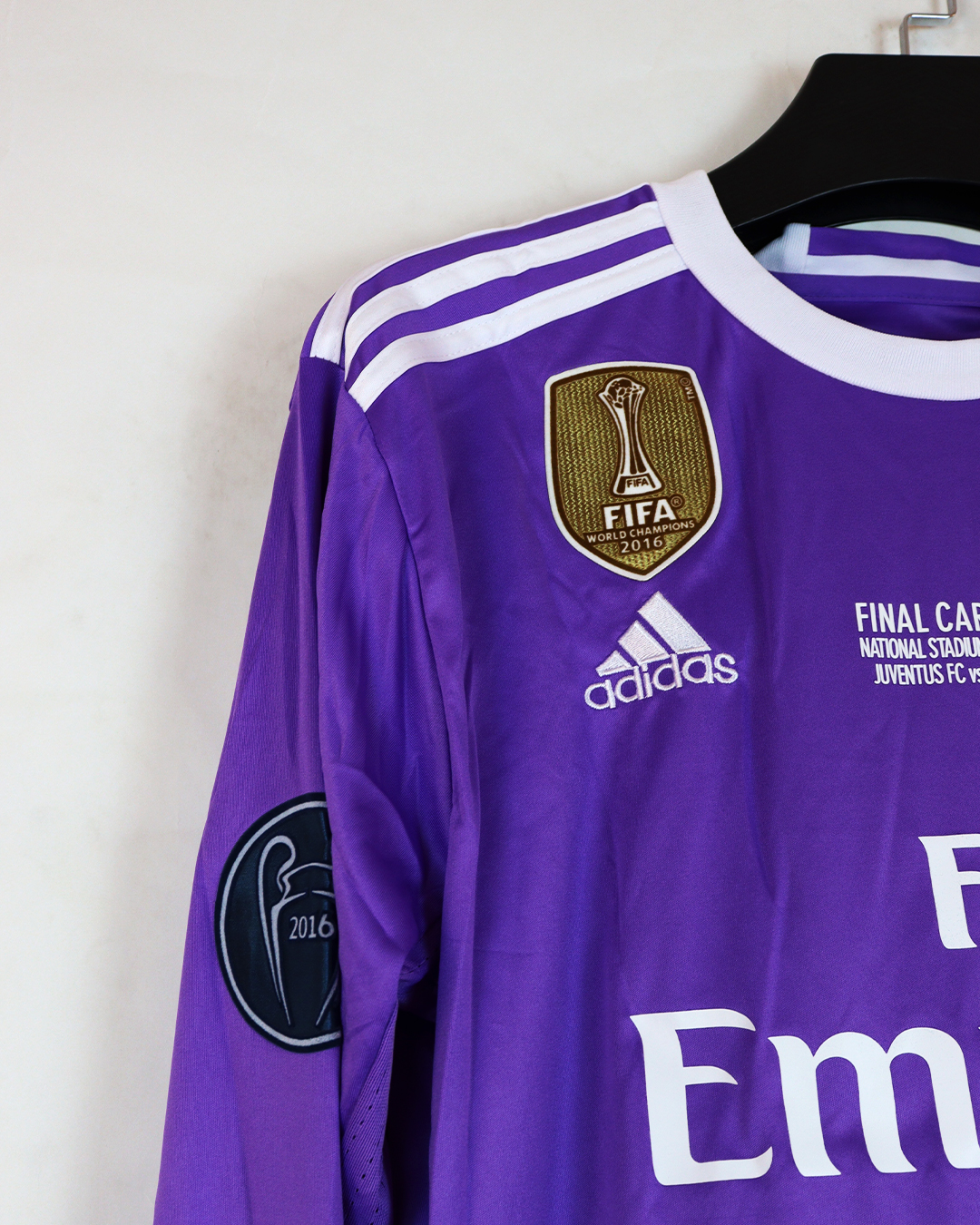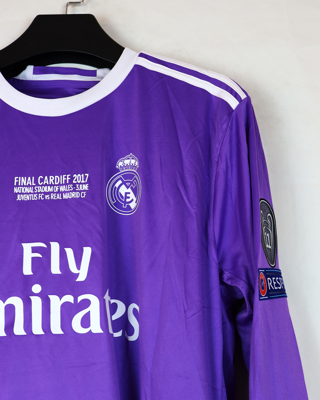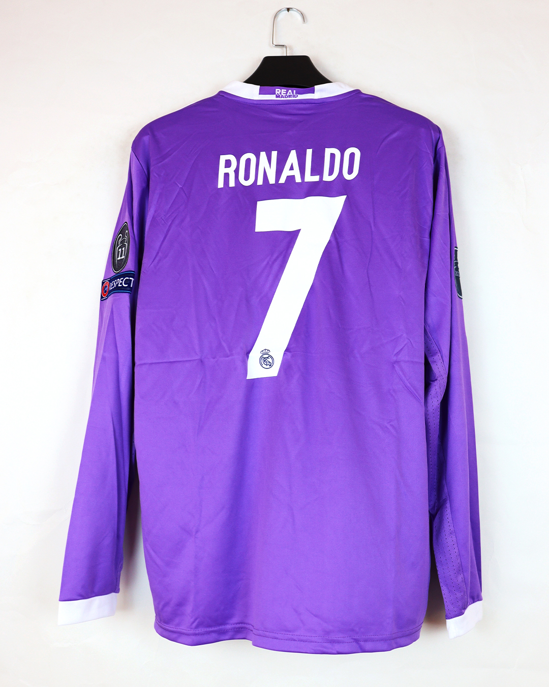 تيشرت ريال مدريد البنفسجي نسخة نهائي دوري الأبطال 2017 كم طويل (ردن كامل) باسم رونالدو كامل الباجات , فقط تيشرت صناعة تايلندية