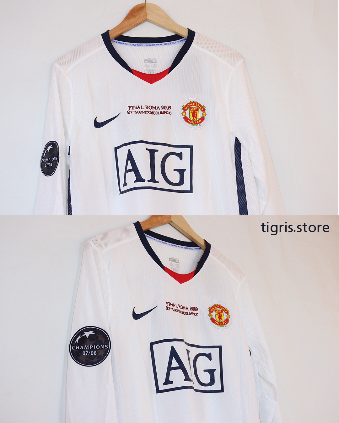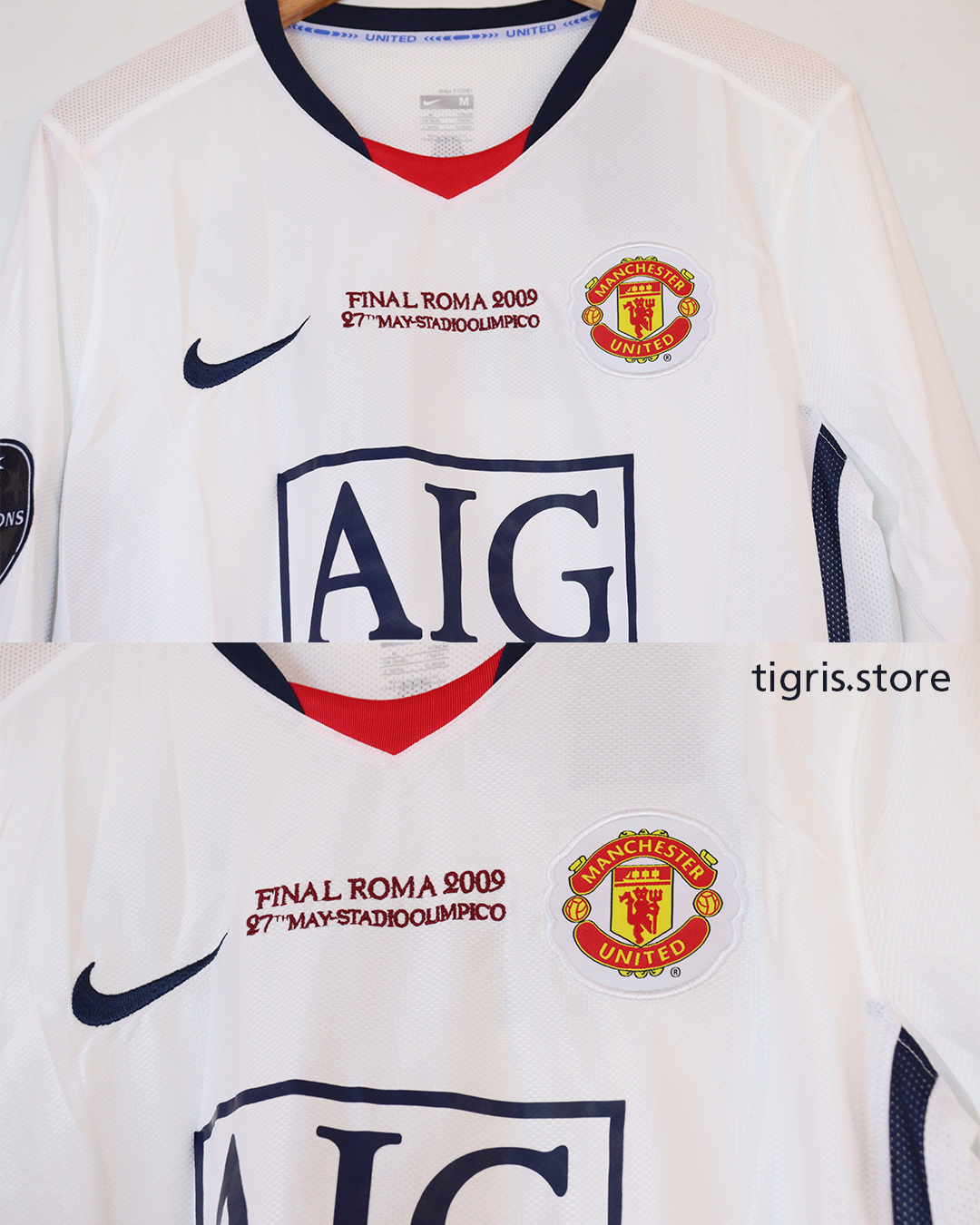 تيشرت نادي مانشستر يونايتد نهائي دوري أبطال أوروبا 2009 كم طويل فقط تيشرت بدون شورت صناعة تايلندية باسم رونالدو وشعارات النهائي