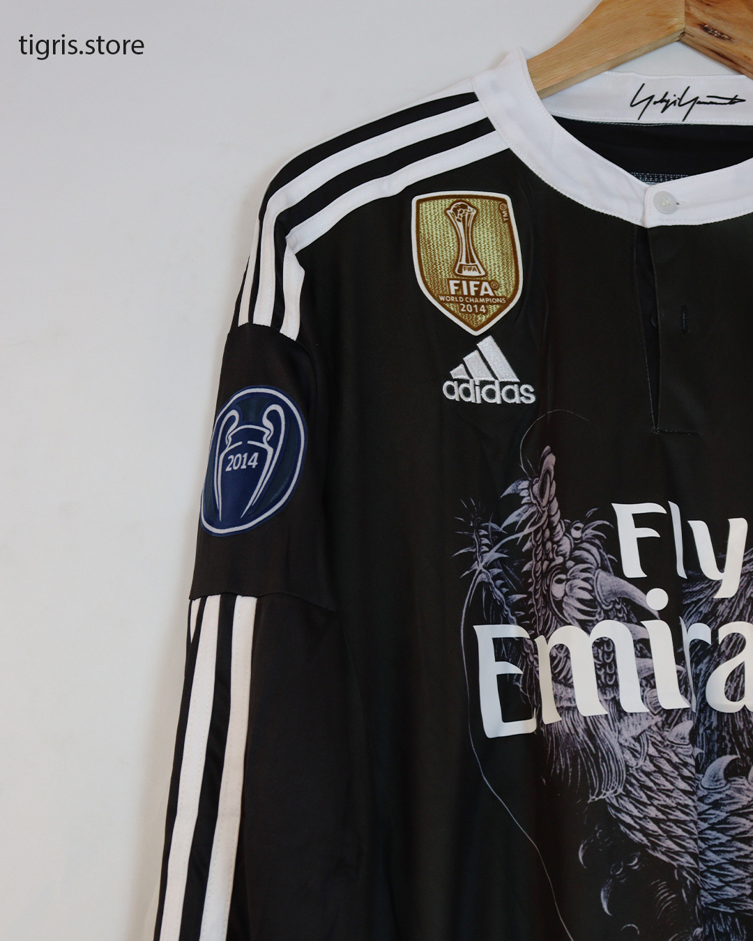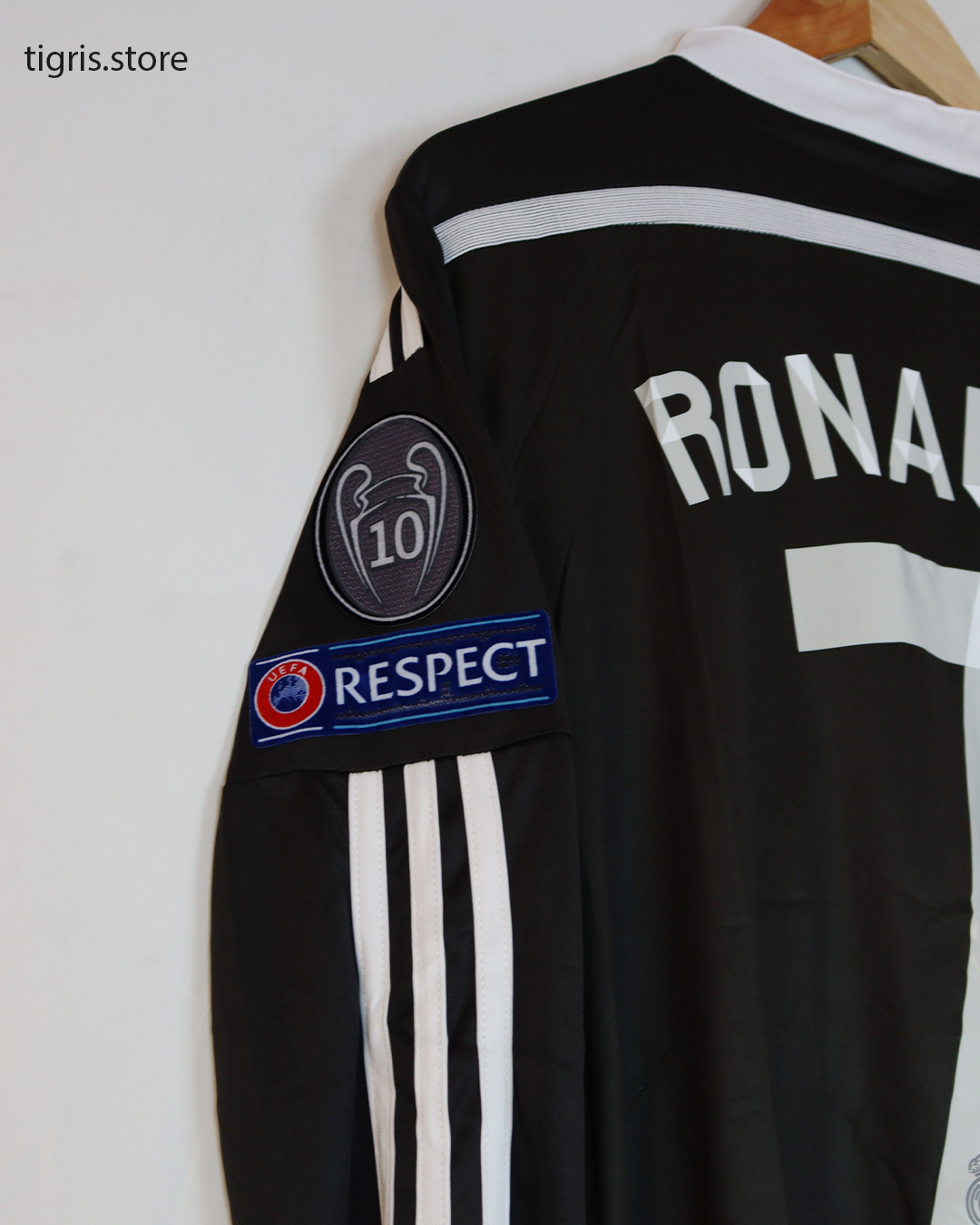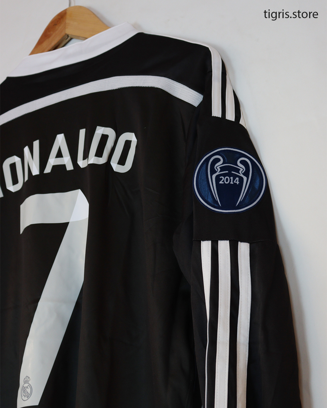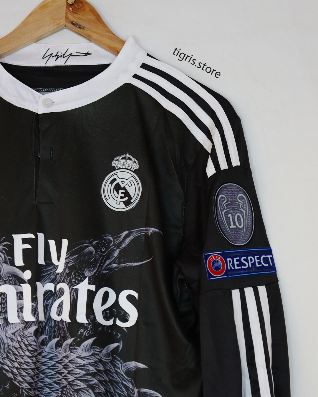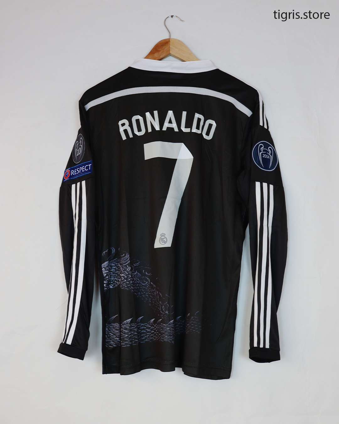 تيشرت نادي ريال مدريد الأسود موسم 2015 بوشم التنين كم طويل باسم رونالدو وباجات دوري الأبطال صناعة تايلندية فقط تيشرت