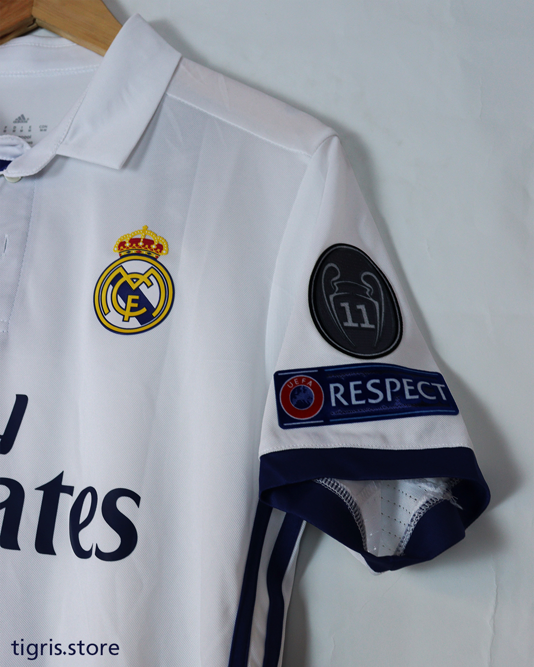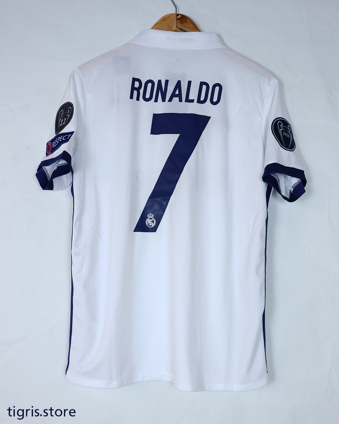 تيشرت نادي ريال مدريد الأساسي موسم 2017 باسمك رونالدو نسخة دوري الأبطال كامل الباجات فقط تيشرت صناعة تايلندية